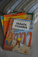 Regnet skvalar ned utanför fönstret och minnet går till tältsemestrar när man låg med ficklampa och läste serier, regnade det riktigt mycket så satt man i den igenimmade bilen och läste. När ungdomarna kommer till sommarstugan så är det serier som gäller, makens Tintin och Lucky Luke rotas fram och plötsligt är man 11 år igen. Härligt!Jag själv minns Tintin allra bäst som en LP-skiva vi hade, vi lyssnade på en grå resegrammofon med avtagbart lock som fungerade som högtalare. Tomas Bolme gjorde Tintins röst och det var Den svarta ön som var den spännande platsen. Nu är det nya tider med Youtube och jag kan gotta mig åt Tintin när jag vill. Bjuder här på inledningan av den tecknade filmen: