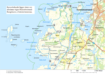 En rejäl vandring är det om man tar sig an kuststigen/soteleden på Ramsvikslandet. Det är en mycket omväxlande vandring med både lättgådda stigar, lite mer krävande klättring och naturen skiftar från de kala hällarna i väster till ljudhedar, snårskog och betade hagar. Det är 14 kilometer men hade jag gått hela rundan hade det tagit mig drygt 5 timmar, nu vek jag av lite från den blå stigen och avverkade bara 11 km idag. Stigarna och lederna är superfint skyltade och nya trappor och stöttor fanns på många ställen, väldigt välordnat! Perfekt väder för en tur var det också, solsken utan att vara varmt och västanvinden mojnade framåt dagen.